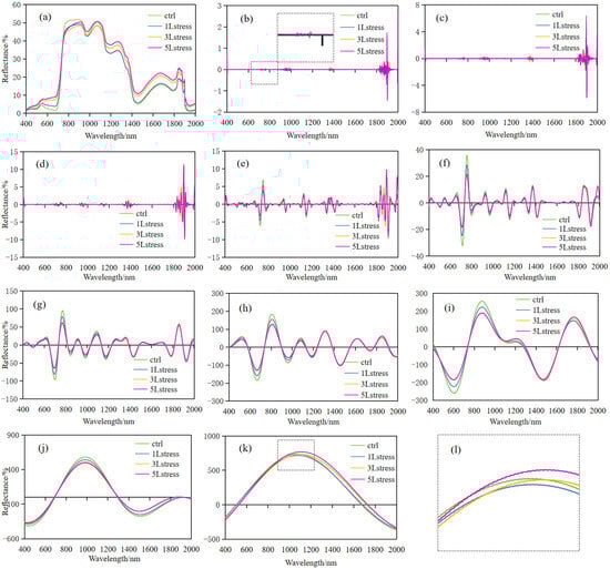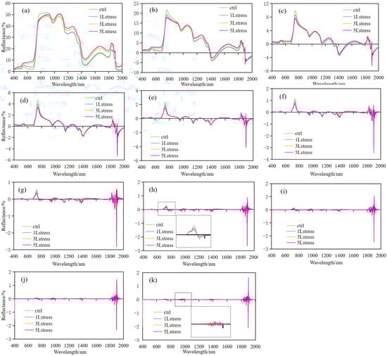 FOD-based reflectance spectral profiles of wheat leaves of different orders (a) raw spectra (b–k) 0.2–2 orders with different order derivatives in steps of 0.2.
