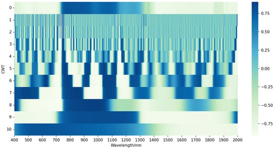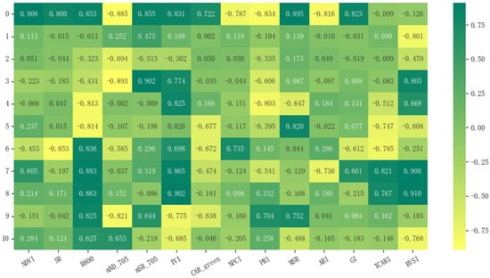 Through the application of the CWT method, we are not only able to decompose the spectral data and extract more detailed and differentiated spectral features, but also significantly amplify the subtle differences of the spectral curves at the key poles, which in turn enhances the sensitivity of detecting the subtle changes in the LCC under CO2 stress. According to the hyperspectral characteristics of plants, various remote sensing vegetation indices are formed by combining visible and near-infrared bands. In this paper, 14 common vegetation indices were identified and calculated from the previous research work, as shown in Table 1.