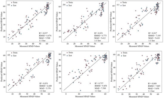 MLR-based regression analyses for single-band, dual-band, and vegetation index features. Dual-band MLR model based on (a) FOD and (d) raw spectra, single-band MLR model based on (b) FOD and (e) raw spectra, and MLR model for vegetation indices based on (c) CWT and (f) raw spectra, with dotted lines in the graphs showing the 1:1 fit line between the predicted and measured LCC values.