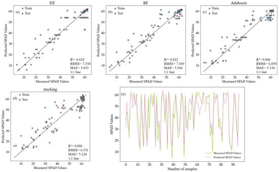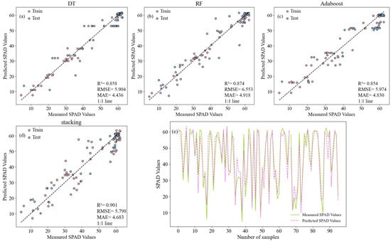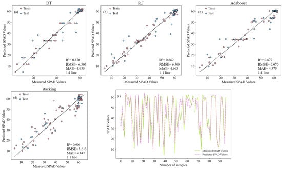 Stacking-based RVI and RVSI estimation results. (a–d) Comparison of R2, RMSE, and MAE between training and test sets for evaluating LCC under 4 models of DTR, RF, Adaboost, and stacking. The dashed line in the figure is the 1:1 fit line between the predicted and measured LCC values. (e) Comparison of predicted and measured LCC values for the stacking model.
