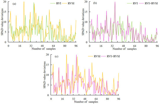 Further analysis of deviation values of LCC values. (a) Comparison of the deviation of LCC values for 1.2-order RVI and cwt8_RVSI, (b) Comparison of the deviation of LCC values for 1.2-order RVI and RVI combined with cwt8_RVSI, and (c) Comparison of the deviation of LCC values for cwt8_RVSI and 1.2-order RVI combined withcwt8_RVSI.