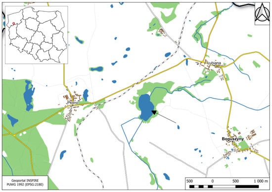 The images for the orthophotomap were acquired from an area of 63.3 ha, located near the small lake Jan (Poland, West Pomeranian Voivodeship, 53°5′24″N, 15°19′24″E). The flying range included lakes, meadows, arable fields, scrubs, and forests. The locations of the study sites are shown in Figure 1.