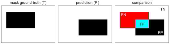 We will present the basic measures of supervised pixel-based evaluation using the standard notations []. Let denotes the ground truth mask, denote the prediction mask, and and be their respective areas. We used standard terms such as (true positive), (false positive), (true negative), and (false negative), for which the following relationships hold (Figure 2):