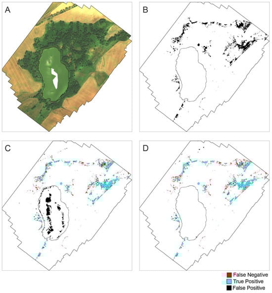 (A) Orthophotomap with marked contours of the range and lake, (B) ground truth mask—location of Heracleum sosnowskyi, (C) prediction compared with mask (model using three channels —RGB), (D) prediction compared with mask (model using five channels—RGB, red edge, near-infrared). For explanation of false negative, true positive and false positive terms, see the explanation on the previous page.