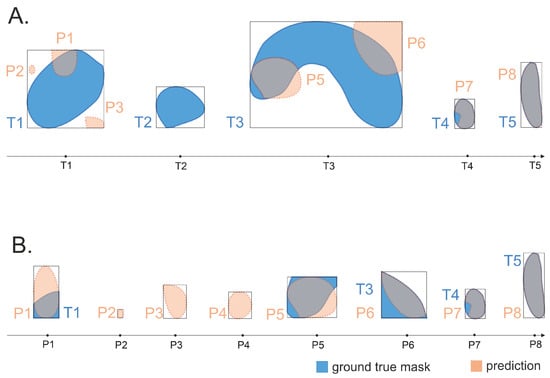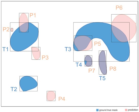 To better understand how the formulas work, consider an example illustration in which a ground truth mask and a prediction mask have been layered on top of each other. Let us denote the ground truth mask as and the prediction mask as . Regions T1, T2, T3, T4, and T5 were separated in the ground truth mask and regions P1, P2, P3, P4, P5, P6, P7, and P8 were separated in the prediction mask as on the illustration below (Figure 4).