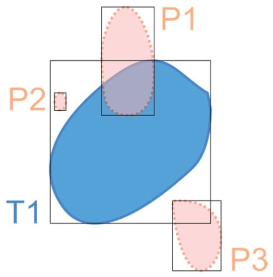 On the other hand, when from the prediction mask matrix we select the same submatrix, there is a possibility that it contains part of the prediction mask, which we call . Here, we can see that parts of orange regions P1 and P3 and the whole region P2 lie in the matrix . Next, we calculated the intersection area of the region of the ground truth mask with the area of the prediction mask. Since all matrices consist entirely of zeros and ones, the -th pixel will belong to the intersection if and only if the product of the values of the -th pixel of the ground truth mask and the -pixel of the prediction mask is equal to 1. Hence, in order to find the intersection area , it is sufficient to multiply matrices and element-wise and sum all the ones of the resulting matrix, thus