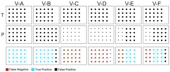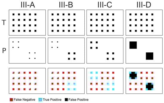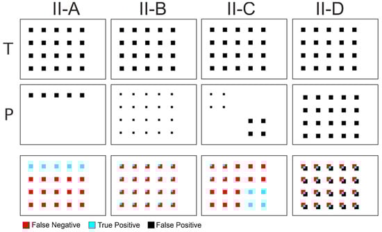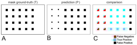 The ground truth mask consists of 20 square regions, each with an area of 100 px. They were arranged in five columns and four rows. The distance between squares was 20 px (Figure 7A). Prediction images were generated as required, with the same size as the ground truth mask, but with varying degrees of correlation with the mask. For example, Figure 7B shows the prediction for 24 regions. The first eight regions (first two columns) were 25 px in the area (5 × 5 px squares) and overlapped with parts of the ground truth mask regions. The next 12 regions (i.e., the next three columns) are 100 px squares, which exactly overlap with the mask regions, and the last 4 regions (last column) are 100 px squares, which do not overlap with any mask region. Figure 7C shows the intersection of the ground truth mask with the generated prediction using the colour convention described earlier (blue: TP—true positive; black: FP—false positive; red: FN—false negative).