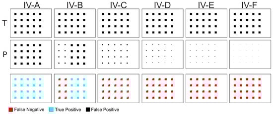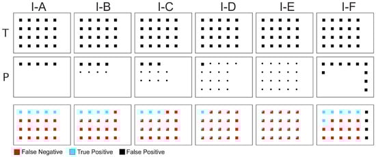 Figure 8 shows a set of six tests (I-A to I-F). In all tests, the ground truth (T) mask was the same. In tests I-A to I-E, the total area of TP hits did not change (25%). In the last test, the TP area increased to 30% but was offset by the FP hits (the FP area was chosen; as a result, the Dice and IoU coefficients remained unchanged).