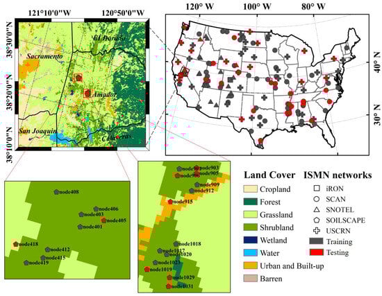 The International Soil Moisture Network (ISMN), established by the Vienna University of Technology and managed by the International Center for Water Resources and Global Change (ICWRGC) of the Federal Institute of Hydrology (FIH) of Germany, is a centralized data-hosting facility created for the calibration of remote sensing products and the validation of land surface models [79]. The ISMN provides the harmonized fractional volumetric SM (m3/m3), while preserving the measurement methods and depths used by the networks [80]. To obtain reliable surface SM, data from all networks and sites must be filtered by measuring the depth (0–5 cm) and then applying quality flags (“G”, which denotes good). With the use of the ISMN dataset (https://ismn.geo.tuwien.ac.at (accessed on 15 June 2023)), we selected 242 stations from five networks (i.e., 81 stations from SCAN, 60 stations from SNOTEL, 46 stations from SOILSCAPE, 53 stations from USCRN, and 2 stations from iRON) distributed across the U.S., based on the availability of in situ data. The locations of these stations, which maintain long-term hourly records of SM observation, are shown in Figure 1. To develop the downscaling framework of surface SM, all stations were divided into two parts: 170 stations were used as training models, and 72 stations were used for testing the performance of the method.