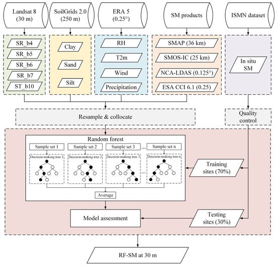 Downscaling framework for the surface SM at 30 m through the integration of multiple datasets.