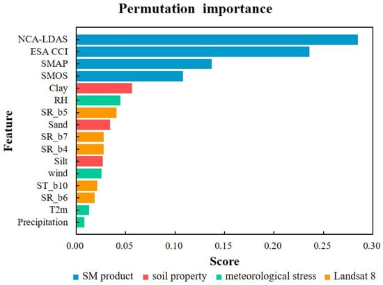 Permutation importance of RF-SM. The features (i.e., input variables) include the SM products (SMAP, SMOS, ESA CCI, and NCA-LDAS), the soil properties (clay, sand, and silt), and the reflectance at visible and near-infrared bands (from SR_b4 to SR_b7), as well as the surface temperature (ST_b10) derived from Landsat 8.