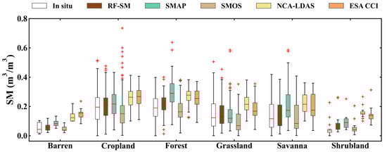 Boxplots of the in situ SM, RF-SM data, and the four SM products (SMAP, SMOS, NCA-LDAS, and KGE) for different land cover types. In the single boxplots, the red cross-dots denote outliers; the lowest and highest lines denote minimum and maximum results, respectively, except for extreme values (outliers); and the lower bound of the box, red line in the box, and upper bound of the box represent the lower quartile (25%), the median, and upper quartile (75%), respectively.