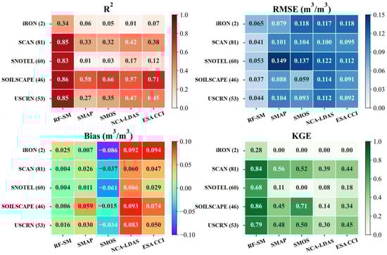 Diagrams of the statistics (R2, RMSE, Bias, and KGE) for the comparison between the RF-SM dataset and the four SM products (SMAP, SMOS, NCA-LDAS, KGE) for the different observation networks.