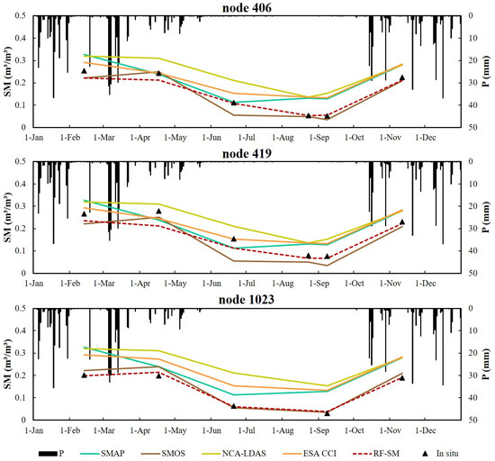To further analyze the temporal variations of RF-SM, the line charts of SM derived from in situ measurements, microwave products, and RF-SM were plotted during 2016 at three representative stations in the substudy area (Figure 7). RF-SM could well capture the temporal variations in SM and respond to precipitation events. Although there is high consistency across all SM data in terms of trends, RF-SM efficiently simulated SM in summer and autumn, while coarse resolution products other than SMOS displayed significant overestimates. In addition, in regards to the overestimation of SMOS during the growing season and its underestimation under rainfall deficiency, RF-SM also improved in the integrated downscaling model using auxiliary variables.