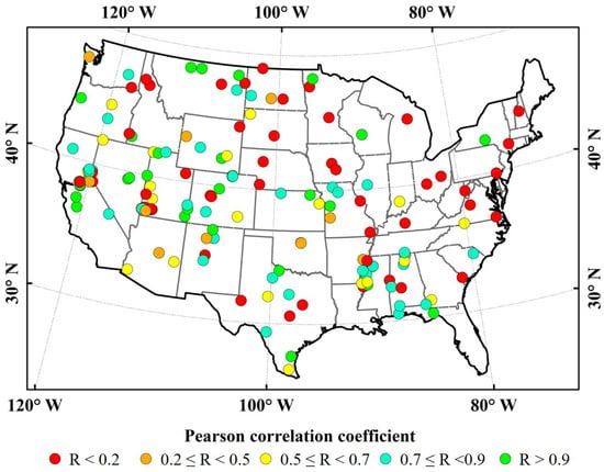 The SWDI derived from the RF-SM dataset (RF-SM-SWDI) and the VHI derived from the Landsat 8 data were calculated over the U.S. for 2016, and the two indices were subsequently compared for all 242 in situ stations in regards to the Pearson correlation coefficient (R). Figure 9 shows that the R values between the RF-SM-SWDI and VHI are greater than 0.5 at most stations in the western mountain areas and plateau basins, but below 0.2 at most stations in the Great Plains area and along the east coast of the U.S. Moreover, the R values were strongly influenced by the performance of the RF-SM dataset in the five ground observation networks (Figure 6), which exhibited obvious differences between the stations. The results from approximately 70% of the stations performed well (R ≥ 0.5), and those from more than 40% of the stations performed fairly well (R ≥ 0.7) in terms of the correlation between the RF-SM-SWDI and the VHI.