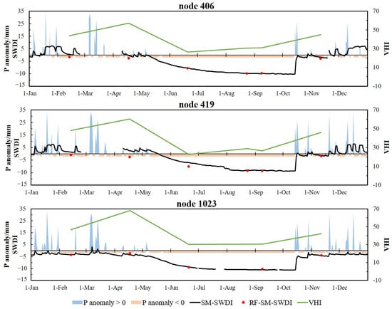 To analyze the temporal evolution of drought in 2016, we calculated the SWDI derived from the observations and the RF-SM data at the three representative in situ SM stations in the substudy area. Figure 10 shows the SWDI, based on in situ SM records (SM-SWDI) available throughout the year, and RF-SM-SWDI, VHI, and precipitation (P) anomalies extracted from the corresponding pixel values derived from the different datasets. The three stations all exhibited typical seasonal characteristics of wet and rainy springs and winters and dry and rainless summers and autumns. Drought occurred from May to November, and the drought severity increased (the SWDI remained below 0, and the VHI remained above 40), especially in September and October. Adequate rainfall in mid-October supplemented the SM deficit and notably relieved the drought. When comparing the different drought indices, the RF-SM-SWDI always agreed with the SM-SWDI, reflecting consistent drought conditions, and the method benefited from the highly accurate RF-SM data. In addition, the temporal variations of the VHI were also similar to those of the SWDI, with R values higher than 0.8 at all three stations.