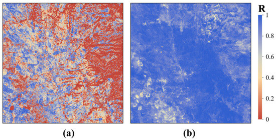In addition, Figure 12 shows the spatial distribution of correlation coefficients between the RF-SM-SWDI and VHI. There was a high correlation between these two drought indices in the substudy area, especially in the grassland cover areas (R > 0.7). Poor correlations (R < 0.2) occurred in the eastern and northern areas, possibly due to the complex topographic conditions, i.e., mountains and river valleys, as well as the vegetation conditions affecting the accuracy of the drought indices. Therefore, although both the RF-SM-SWDI and VHI provide evident potential for monitoring agricultural field drought, their consistency and differences should be further analyzed.