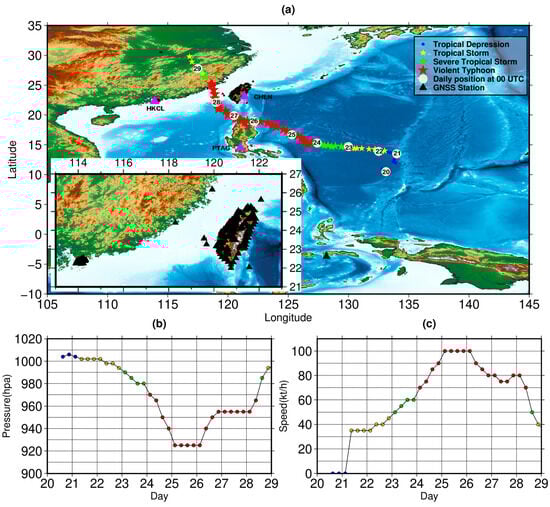Typhoon Doksuri wreaked havoc in the Philippines, Vietnam, and China in July 2023. Originating from the western Pacific Basin on 20 July as a low-pressure area, it began with a central pressure of approximately 1005 hPa and a wind speed of 30 knots/h. Tracking northwestward, it swiftly intensified into a formidable typhoon on 24 July with the central pressure dropping to around 940 hPa and the wind speed increasing to approximately 90 knots/h. Doksuri reached its most violent level on 25 July with a lowest pressure of 925 hPa and a peak wind speed of 100 knots/h. Following this, Doksuri steadily weakened after making landfall in the Philippines. Eventually, it moved towards Fujian, China, and dissipated early the next day. The entire trajectory of Typhoon Doksuri, along with the changes in central pressure and average speed, is illustrated in Figure 1. Additionally, the distribution of ground-based GNSS receivers for this study is also detailed.