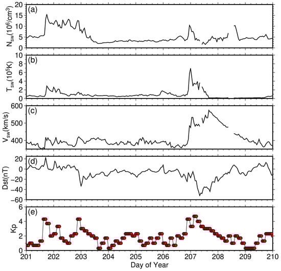 In Figure 2a, the proton density of solar wind experienced a sudden increase from approximately 5.3 × 1016/cm3 at Universal Time (UT) 16, DOY 201, to about 13.7 × 1016/cm3 at 18 UT, DOY 201. Simultaneously, both the temperature and speed of solar wind reached their maxima at around 3.6 × 105 K and 416 km/s, respectively. Concurrently, geomagnetic indicators show a decrease in the Dst index to approximately −35 nT, and the Kp level raised to 4 during this initial fluctuation. In contrast, during the second fluctuation, the proton density was lower, but other indicators exhibited significantly higher intensities. For instance, the maximum proton density occurred at 23 UT, DOY 206, with a value of 9.7 × 1016/cm3, while the temperature and speed experienced a sudden surge to around 7 × 105 K and 580 km/s, respectively. Additionally, the Dst dropped to a minimum level of approximately −50 nT, and the Kp increased to the class of 5. The findings from Figure 2 suggest that the solar-terrestrial environments experienced fluctuations during the formative and decline phases of Typhoon Doksuri, with fewer severe space events observed during the mature phase.
