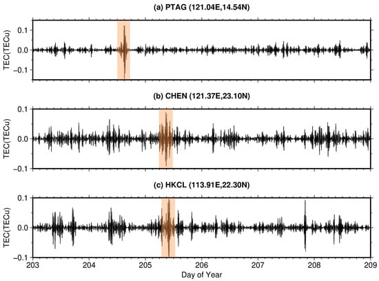 This study specifically selects three GNSS stations located in the vicinity of Typhoon Doksuri’s trajectory to examine the ionospheric response. The station list includes PTAG (121.04°E, 14.54°N), CHEN (121.37°E, 23.10°N), and HKCL (113.91°E, 22.30°N), with their geographic positions indicated by purple triangles in Figure 1. The anomalous signals of VTEC time series from these three stations are extracted using a fifth-order Butterworth filter with cutoff periods ranging from 10 to 25 min.