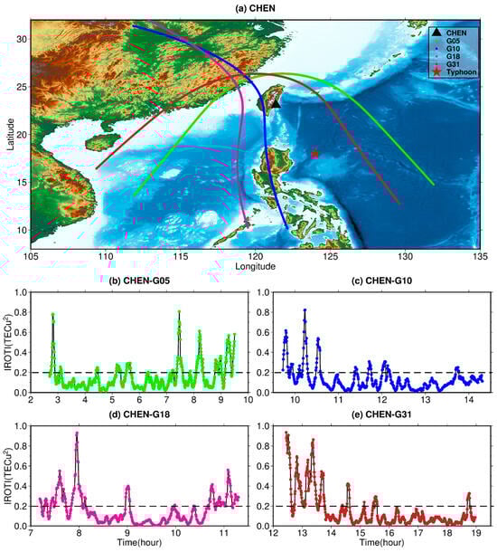 Given the heightened plasma fluctuations on DOY 205, the fluctuations of slant total electron content (STEC) observed by several Global Positioning System (GPS) satellites are illustrated in Figure 4. Figure 4a depicts the trajectories of STEC rays measured by CHEN on DOY 205. These trajectories are around Typhoon Doksuri, indicating that the typhoon may have had an effect on the radio rays, inducing noticeable plasma fluctuations. Plasma irregularities are estimated using the time integral and rate of the total electron content index (IROTI). The new index proposed by Ren et al. [27] could effectively identify ionospheric irregularities based on the coupling effect of amplitude change and phase mutation. Experimental results demonstrate that IROTI can successfully detect and recognize equatorial plasma bubbles (EPBs), as well as LSTIDs and MSTIDs during both geomagnetically quiet and stormy days.