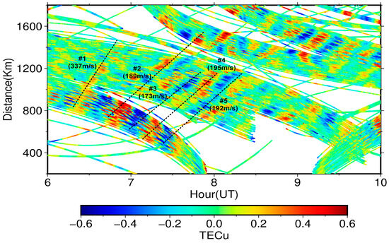 The first fluctuation emerged at around 06–07 UT on DOY 205 with a magnitude of approximately 0.2 TECu; the propagated speed reached 337 m/s. As the speed of Typhoon Doksuri increased, the amplitude of subsequent fluctuations intensified to around 0.4–0.6 TECu. All TEC fluctuations propagated from the epicenter to approximately 1400 km distance. The slope of coherent TEC irregularities in plots of the distance from the epicenter versus time is traced to characterize the wave propagation speed. For more detailed information, please refer to Themens et al. [11]. The two-dimensional wave fronts of plasma irregularities reveal that the five fluctuations on DOY 205 propagated with speeds ranging from 173 m/s to 337 m/s, consistent with the velocities of Medium-Scale Travelling Ionospheric Disturbances (MSTIDs) reported in previous studies [11,14,37].