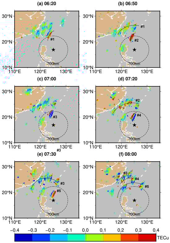 Figure 6 illustrates distinct plasma irregularities around the typhoon’s eye. From 06:20 UT, a cluster of northwestward plasma irregularities (NO. #1 TIDs) with a magnitude of approximately ~0.2 TECu accumulated at the edge of rainbands. As Typhoon Doksuri moved northwestward, these accumulated plasma irregularities gradually moved outward from the eye, intensifying in response to the increasing speed. For example, at 06:50 UT, the #1 TIDs arrived at Taiwan island, which was ~1200 km away from the typhoon’s eye. At the same moment, #2 TIDs, with the maximum magnitude of more than 0.4 TECu, were generated from the gale wind zone. Figure 6c–f shows that #3, #4, and #5 TIDs all emanated from the gale wind zone during the period of 07–08 UT, and gradually propagated to the rainband over the subsequent hours. All the TIDs presented with a concentric structure, which agrees well with the structure of the ionospheric disturbances induced by Typhoon Hato [12].