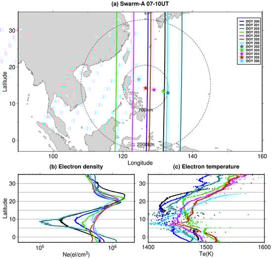 Swarm-A and Swarm-B operate in different orbital planes at altitudes of 462 km and 511 km, respectively. The unique structure of the Swarm constellation provides a distinct advantage in elucidating topside ionospheric plasma changes during severe space or geophysical events. As indicated in Figure 5 and Figure 6, Typhoon Doksuri induced significant plasma fluctuations on DOY 205. Consequently, profiles obtained from Swarm-A in the period of 07–10 UT during 200–206 are employed to analyze changes in electron density and electron temperature in the topside ionosphere in Figure 7.