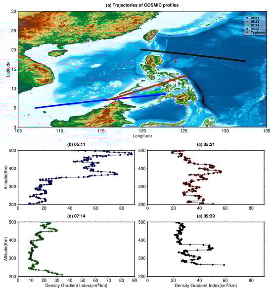 Figure 8a depicts the ground tracks of COSMIC-2 plasma profiles that are close to Typhoon Doksuri, indicating that ionospheric electron densities may be influenced by the tropical cyclone. Figure 8b–e show that the ionospheric electron densities surrounding Typhoon Doksuri experienced significant perturbations, and the horizontal gradient of plasma fluctuations in the topside ionosphere was evidently higher than that in the bottom-side ionosphere. For example, in Figure 8b, the horizontal density gradient under the altitudes of 350 km was approximately 20 el/cm3/km, but it abruptly increased to 50–80 el/cm3/km at altitudes of 350–500 km. This phenomenon was also observed in the other three profiles. At 05:21 UT, the maximum density gradient in the topside ionosphere occurred at altitudes of 350–400 km, as well as in the profile at 09:39 UT. However, for the profile at 07:14 UT, the layer of maximum horizontal density gradient uplifted to 450–500 km with a value of 30 el/cm3/km. Overall, the topside density gradient was 1.5 to 2 times larger than that in the bottom-side ionosphere. Results from Figure 7 show that Swarm-A detected significant plasma enhancements in the topside ionosphere (~462 km). The fluctuations of COSMIC-2 profiles detected by the GRDI index agreed well with Swarm.
