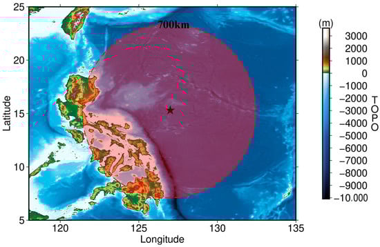 Topography along the trajectory of Typhoon Doksuri on DOY 205, where the red region with a radius of 700 km indicates the influence of gale-force winds.