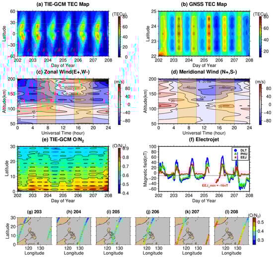 Time-latitudinal variations of (a) TEC and (e) thermospheric O/N2 ratio during DOY 202–207 simulated by the Thermosphere-Ionosphere-Electrodynamics General Circulation Model, along with observational data, including (b) Global Navigation Satellite System-TEC, (c,d) Zonal and Meridional winds (121°E, 23°N) simulated by the Horizontal Wind Model 2014 empirical model on DOY 205, and (f) temporal variation of the equatorial electrojet estimated by the difference between DLH and PHU. Additionally, (g–l) showcase changes in the thermospheric O/N2 ratio within a longitudinal range of 110–140°E, as derived from the Global Ultraviolet Imager (GUVI) on TIMED satellite.