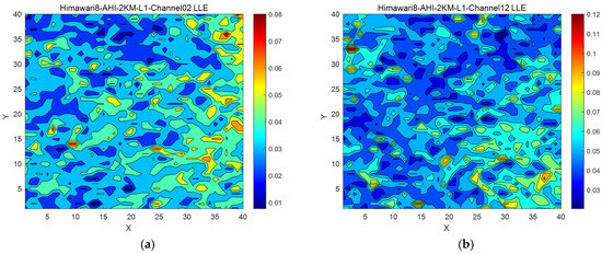 (a) 40 × 40 LLE diagram of Himawari-8 AHI Full Disk 2KM L1 data for Channel 2; (b) 40 × 40 LLE diagram of Himawari-8 AHI Full Disk 2KM L1 data for Channel 12.