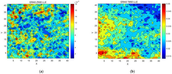 (a) 41 × 41 LLE diagram of ERA5 hourly data for Z500; (b) 41 × 41 LLE diagram of ERA5 hourly data for T850.
