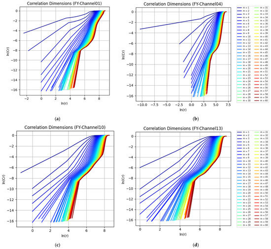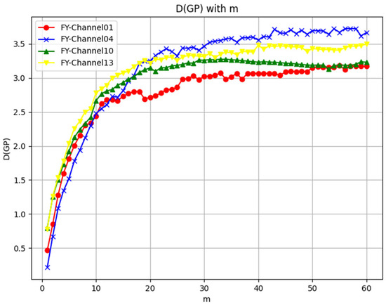 For the FY-4A AGRI China region 4KM L1 data at each grid point in each channel, data were extracted for a time length of 90 days with a temporal resolution of 165 times per day, resulting in a total sequence length of 14,850. Channel 1 (visible band, central wavelength 0.47 microns), channel 4 (shortwave infrared band, central wavelength 1.375 microns), channel 10 (midwave infrared band, central wavelength 7.1 microns), and channel 13 (longwave infrared band, central wavelength 12.0 microns) were taken as examples to calculate the correlation dimensions. Utilizing the G–P method described in 3.2 (see Equations (7) and (8)), the log–log plots of the correlation integral versus the distance for different embedding dimensions m were plotted as Figure 5a–d, corresponding to these 4 channels of FY-4A, respectively. Then, the correlation dimensions were calculated using the curvature-based method proposed in Section 3.2 (see Equations (12) and (14)). The results obtained were largely consistent with the scaling region identified through subjective observation, which validated the feasibility and accuracy of this method. Furthermore, the -m curves of these 4 channels were plotted as Figure 6. From Figure 6, the consistency of the estimated correlation dimension across different embedding dimensions has been verified, which further demonstrated the robustness and accuracy of this curvature-based method.