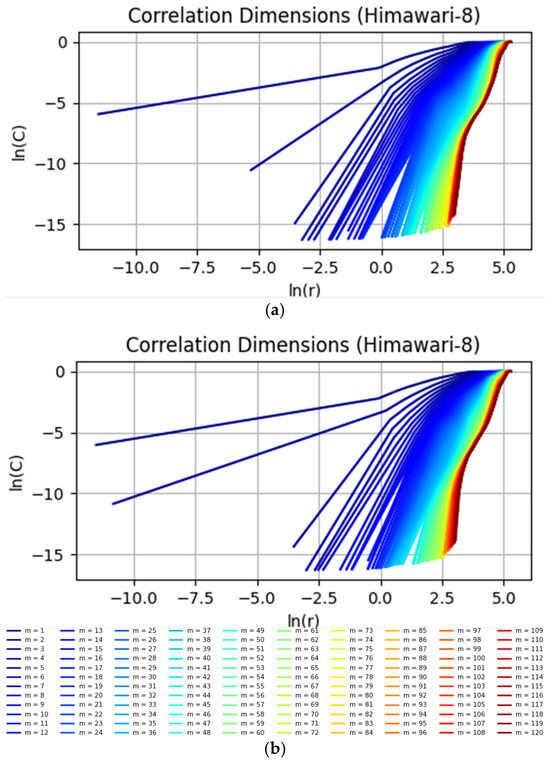 (a) Log–log plots of the correlation integral versus the distance for different embedding dimensions m for channel 2 of Himawari-8 AHI full-disk 2KM L1 data; (b) Log–log plots of the correlation integral versus the distance for different embedding dimensions m for channel 12 of Himawari-8 AHI full-disk 2KM L1 data.