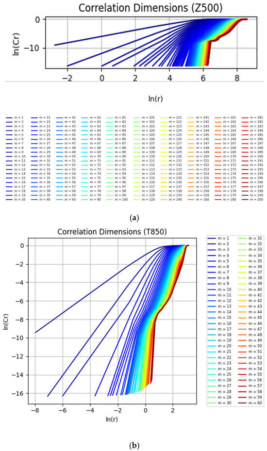(a) Log–log plots of the correlation integral versus the distance for different embedding dimensions m for Z500 hourly data of ERA5 at 20.00°S, 175.00°W; (b) Log–log plots of the correlation integral versus the distance for different embedding dimensions m for T850 hourly data of ERA5 at 20.00°S, 175.00°W.