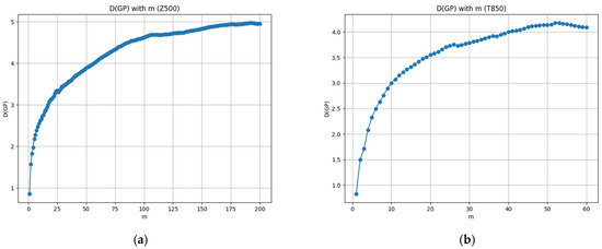 For the ERA5 reanalysis dataset from European Centre for Medium-Range Weather Forecasts (ECMWF), specifically the 500 hPa geopotential height data and the 850 hPa temperature data, data were extracted for the period from 2015 to 2021 with an hourly resolution, resulting in a total sequence length of 61,368. Utilizing the G–P method, described in Section 3.2 (see Equations (7) and (8)), the log–log plots of the correlation integral versus the distance for different embedding dimensions m were plotted as Figure 9a,b, corresponding to Z500 and T850 hourly data of ERA5 at 20.00°S, 175.00°W, respectively. Then, the correlation dimensions were calculated using the curvature-based method proposed in Section 3.2 (see Equations (12) and (14)). The -m curves were plotted as Figure 10. The scaling regions obtained were largely consistent with those identified through subjective observation. And the consistency of the estimated correlation dimension across different embedding dimensions has been verified in Figure 10, which demonstrated the feasibility and accuracy of this curvature-based method.