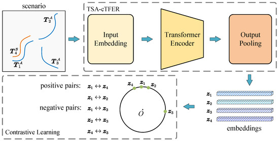 TSA-cTFER network overview. This figure illustrates the process of extracting features from track segments using TSA-cTFER, and compares these features to assess the similarity between track segments, thereby determining whether they originate from the same target. The scenario trajectory data include interrupted track segments, such as and , or multi-source track segments, such as and . After processing by TSA-cTFER, each track segment acquires high-dimensional feature representations (). Track segments originating from the same target are defined as positive pairs, e.g., and , while all others are categorized as negative pairs. Through contrastive learning, the network continuously minimizes distances between positive samples and maximizes distances between negative samples to achieve effective track segment association.