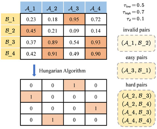 Subsequently, a score matrix is constructed based on the similarities obtained from Algorithm 1. The Hungarian algorithm [6] is then employed to solve the matrix, yielding candidate association pairs. It is important to note that the introduction of dummy tracks in (11) is primarily intended to indicate that certain tracks may not have corresponding associated tracks. In this context, dummy tracks are not explicitly constructed; instead, the matching results of the Hungarian algorithm are re-evaluated, and some track associations with low similarities are discarded. Candidate association pairs with a score value below are directly labeled as invalid. Among the remaining candidate association pairs, those that have another pair with a score difference less than are categorized as hard pairs; otherwise, if the association score is greater than , it is considered an easy pair, while the remaining pairs are considered invalid. The selection procedure for invalid/easy/hard association pairs is detailed in Algorithm 3 and illustrated in Figure 5. We primarily determine the existence of similar association pairs based on score differences, and then judge whether the association pair is considered an easy or hard case.