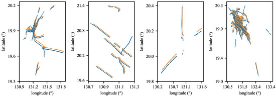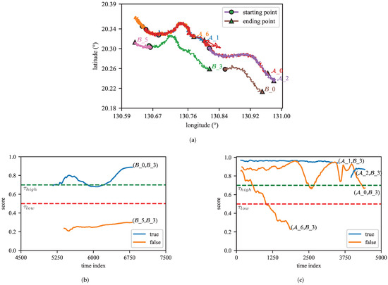 This situation leads the model to assign excessively high scores to false association pairs. As illustrated in Figure 14a, there is significant overlap between the track segments and . Moreover, as discussed in Section 5.4.1, we utilized only the latitude and longitude position information during training; other data features, such as heading angle and speed, were excluded due to inaccuracies in the dataset. As a result, from the perspective of model input, the trajectory information exhibits considerable similarity, which can further mislead the model’s associations. Furthermore, we assess similarity based on the distance between feature vectors, processing each trajectory independently through the network. For efficiency reasons, we chose not to implement a framework that concatenates and jointly processes the two trajectories, which restricts the model’s effectiveness in the ITSA task, particularly in scenarios involving numerous similar trajectories.