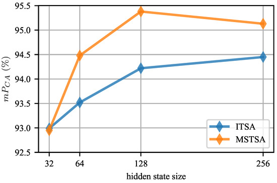 Effect of hidden state size. The sizes of hidden layers in a model determine its representation abilities. In Figure 10, when the hidden layer size is increased gradually from 32 to 256, there is an observed improvement in average accuracy for both ITSA and MSTSA tasks. The maximum improvement recorded is approximately . Therefore, it can be concluded that larger models tend to achieve higher average accuracy. However, it is important to note that larger models also require more GPU memory and training time during the training process.