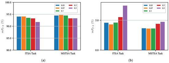 Effect of different contrastive loss temperatures. (a) variation for different contrastive loss temperatures. (b) variation for different contrastive loss temperatures.