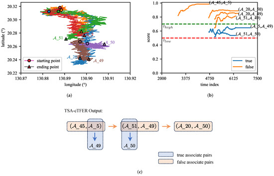 In this challenging association scenario, as shown in Figure 14, multiple adjacent track segments lead to a high probability of misjudgment by the TSA-cTFER. Such misjudgments can significantly impact subsequent determinations of association pairs, resulting in the propagation of association errors. Specifically, the trajectories of the targets in the scene, illustrated in Figure 14a, show that the distances between the targets are very close and their motion patterns are similar. This similarity complicates the process of determining which track segments belong to the same target. The scores of various association pairs computed by TSA-cTFER over time, as depicted in Figure 14b, indicate that in this scenario, the scores for false associations surpass those for true ones. Consequently, the model outputs false associations such as , , and . Furthermore, Figure 14c provides a schematic representation of the propagation of association errors. Initially, the model identifies the association pair as valid. Due to the one-to-one association constraint, it does not pair with its true associated track . Subsequently, is paired with , further restricting from pairing with . Ultimately, can only be paired with .