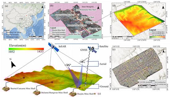 (a) The location of Shendong Coal Group around the world; (b) optical image map of the Shendong Coal Group (acquired on 18 April 2023); (c) the red star represents approximate location of Huojitu Mine Shaft, 3D terrain generated by the Copernicus DEM (resolution is 30 m); (d) topographic map of Huojitu Mine Shaft; (e) location distribution of UAV RTK checkpoints.