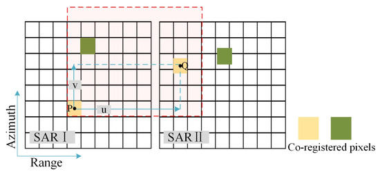 In Equation (1), , is the normalized cross-correlation; and are the range and azimuth oriented offsets of the feature window, respectively; , are the row and column numbers in the image, respectively; is all the pixels in the master image feature window in row and column ; is all the pixels in the slave image feature window in row and column .