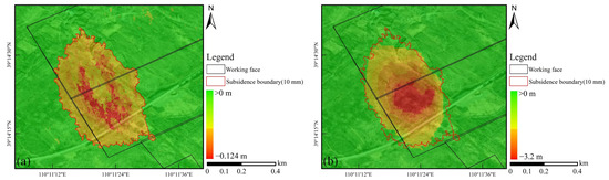 (a) DInSAR results; (b) POT results; the red boundary represents the 10 mm CMSF boundary.