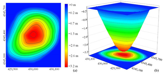 In Equation (5), represents the RMSE of elevation before the subsidence event occurs, and represents the RMSE of elevation after the subsidence event occurs. Accordingly, it can be estimated that the RMSE of subsidence after the DEM difference is 0.055 m (55 mm), which is negligible for large gradient subsidence.