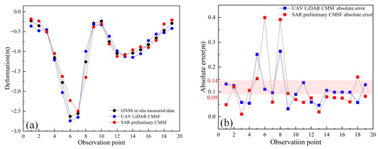 Because the UAV LiDAR data and the GNSS in situ measured data do not match completely in the data acquisition time, some points after H24 are slightly higher than the ground observation data (Figure 13 ). However, at the center of the CMSF, the MAE, AAE, and RMSE between the UAV LiDAR CMSF and GNSS in situ measured data are 264 mm, 84 mm, and 98 mm, respectively. It can be seen that UAV LiDAR CMSF (RMSE: 59 mm) is superior to SAR preliminary CMSF (RMSE: 114 mm) in identifying a large gradient subsidence. Due to the millimeter errors of UAV LiDAR DEMs themselves, the obtained UAV LiDAR CMSF have relatively large errors in the CMSF boundary, which has limitations in monitoring the small gradient subsidence of the CMSF boundary. Moreover, by comparing Table 4 and Table 5, it can be found that UAV LiDAR CMSF (RMSE: 178 mm) is weaker than SAR preliminary CMSF (RMSE: 21 mm) in small gradient subsidence monitoring.