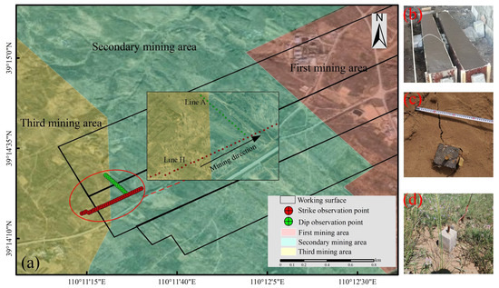 (a) Mining area and point layout diagram. (b) Pouring cement of the GNSS in situ measured points. (c,d) Placement diagram of GNSS in situ measured points.