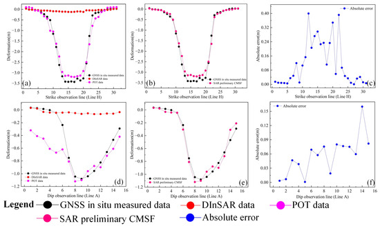 (a,d) The deformation comparison of the DInSAR, POT, and GNSS in situ measured data in Line H and Line A, respectively. (b,e) The deformation comparison of the SAR preliminary CMSF and GNSS in situ measured data in Line H and Line A, respectively. (c,f) The error between SAR preliminary CMSF and GNSS in situ measured data in Line H and Line A, respectively.
